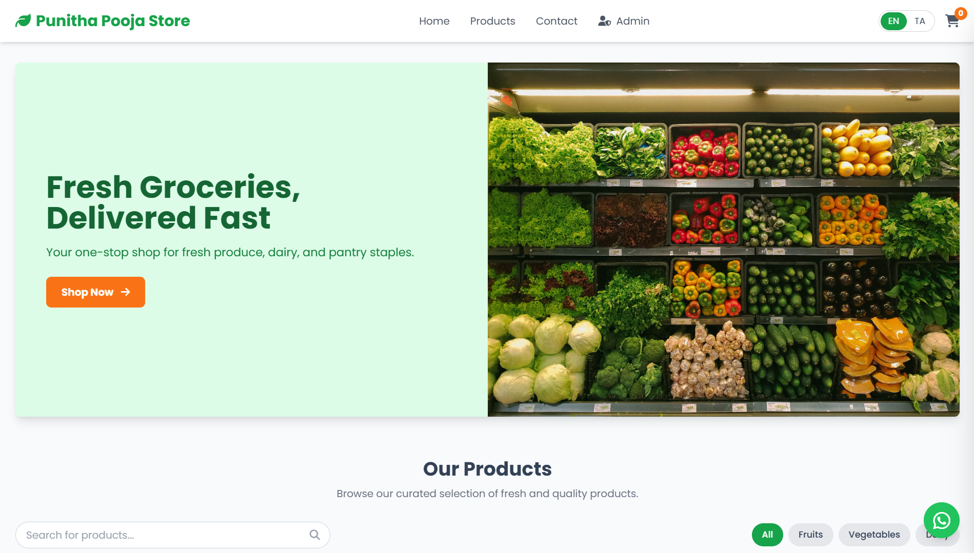 Live PreviewA bilingual grocery website offering fresh products with cart, order, and WhatsApp checkout features.